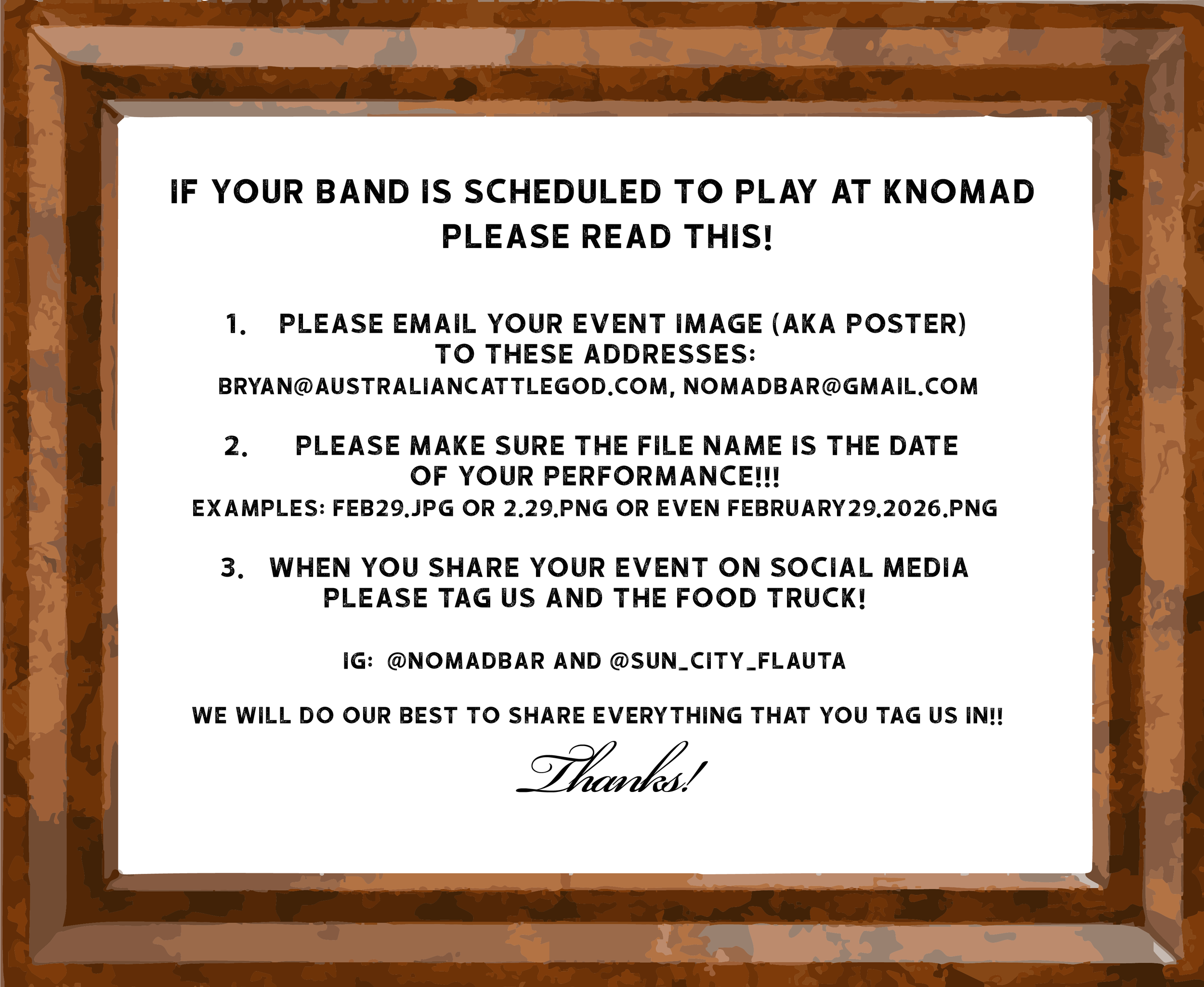 • Load in through the front door and set your equipment to the left of the stage
